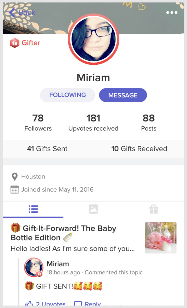 It’s been such a wonderful experience to have a community like this for my job. And when I joined Glow I immediately saw that same community as well. I was so excited to see so many people reaching out and being a support system to complete strangers. And when I saw the “Gift it Forward” movement I was even more awestruck how this positivity could impact someone that is struggling. I wanted to join in immediately, helping others has always been instilled in since I was very young. So seeing this was a joy for me and I hope I can teach my daughter the same. I usually gift the essentials first (diapers, diaper rash cream, safety kits for the little ones) and sometimes I splurge just a little more when I can.